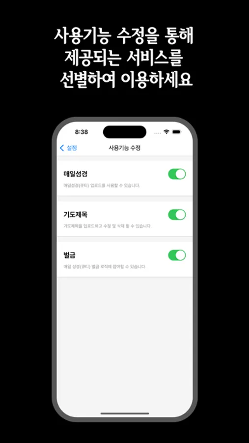 매일매일 성경을 묵상하기 위한 성경 묵상 컨텐츠를 업로드하지 않은 날을 계산하여 벌금을 내는 벌금제도를 이용할 수 있습니다. - 부담스럽다면 사용기능 수정을 통해 이 기능을 비활성화 하실 수 있습니다.