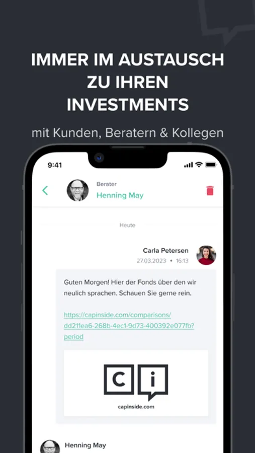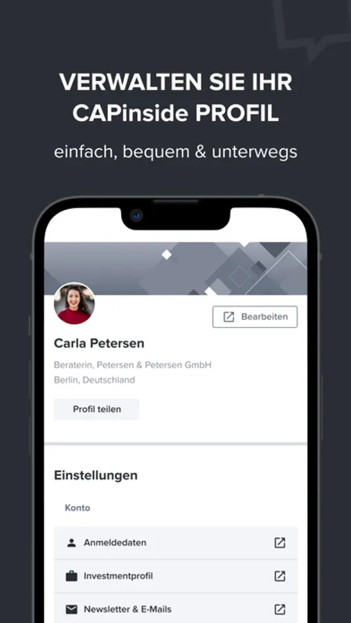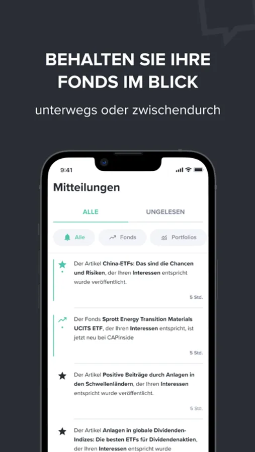 Mit der CAPinside App sind Sie auch mobil immer auf dem neuesten Stand. Durch Push-Notifications erhalten Sie Updates zu Ihrer Watchlist, Ihren Portfolios, neuen Events und Inhalten, die zu Ihren gewählten Interessen passen. Ein Muss für alle Member der CAPinside-Community und die, die es werden wollen.