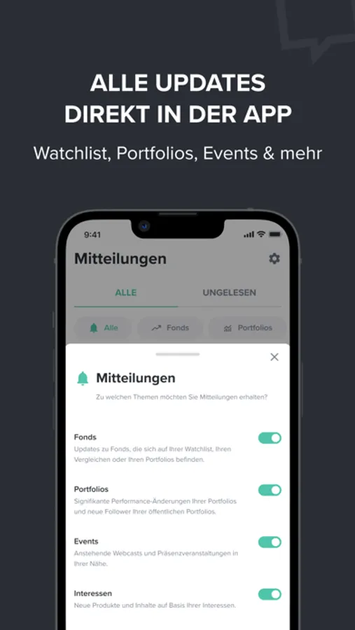 2. Stellen Sie Ihre Notifications ein. Sie entscheiden selbst, zu welchen Bereichen (Fonds, Portfolios, Events, Interessen, Profil) Sie benachrichtigt werden möchten.