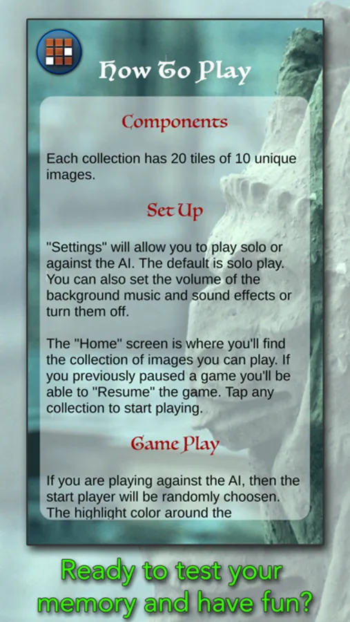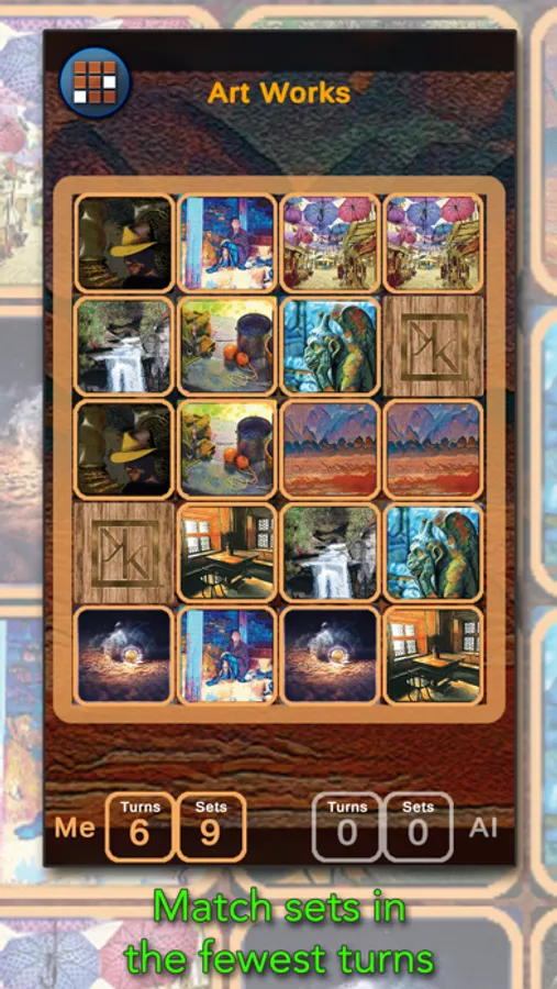 The Art of Recall includes 2 collections of 20 tiles of 10 sets. The game can be played solo or against the AI. The goal is to find and match tiles to create sets. When playing against the AI try to collect the most sets. If playing solo try to collect all sets in as few turns as you can.