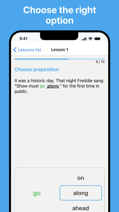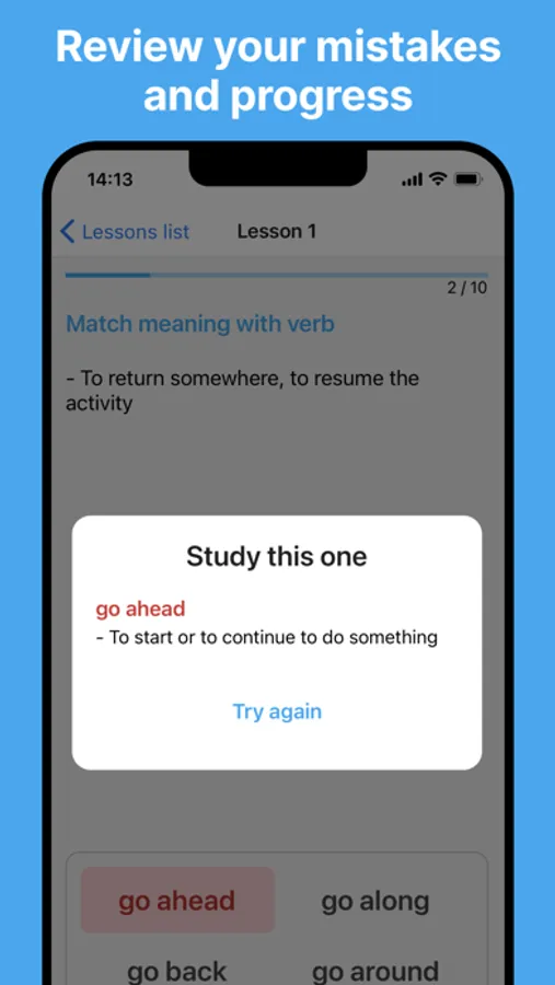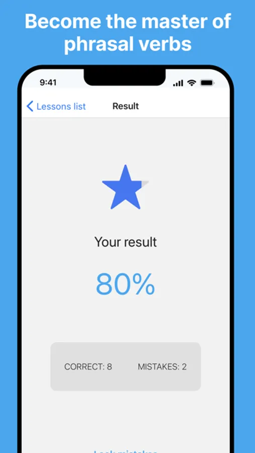 While learning English phrasal verbs, you will test your knowledge by taking tests in which you are asked to choose the correct phrasal verb or part of it. Upon completion of the test, the application shows you the result.