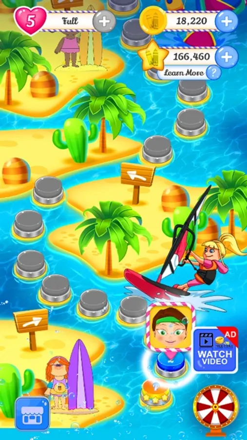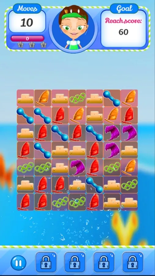 Wow Crush is an exciting matching game that revolves around the world of Wind surfer girls. The objective of the game is to match three or more similar surfing-related items, such as surfboards, dumbbells, or beach balls, to score points and progress through different levels.