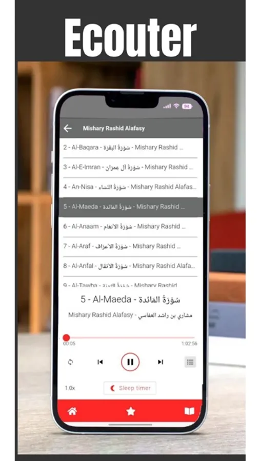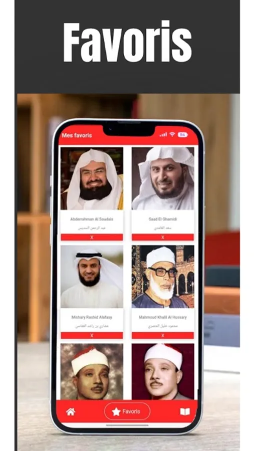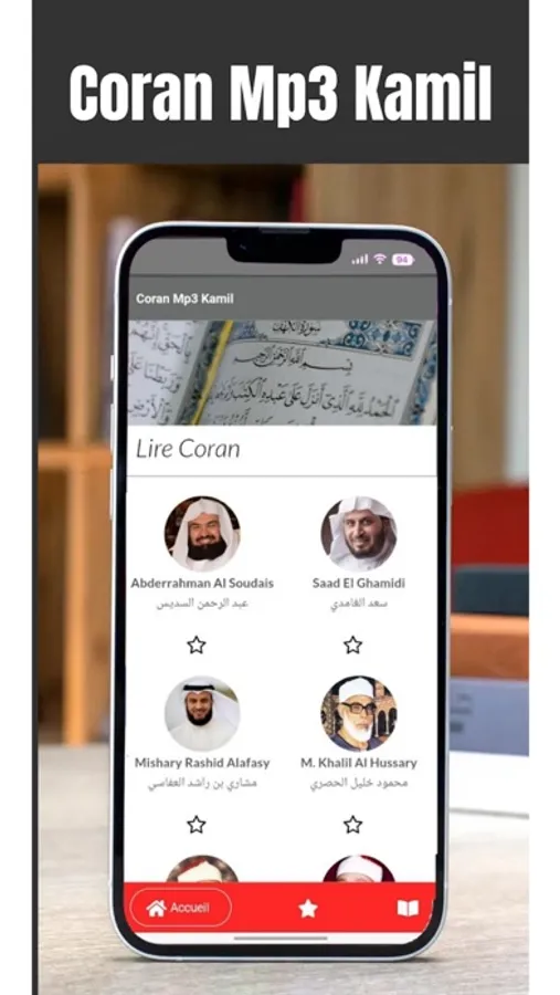 - Pour écouter le coran, vous pouvez choisir vos récitateurs préférés et les mettre en favori.
