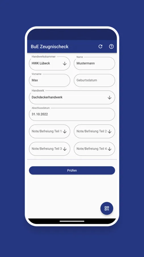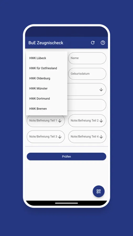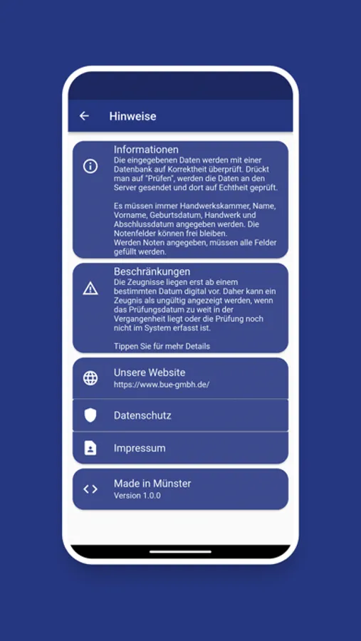 Mit Hilfe unserer App „Zeugnischeck“ kann ein vorgelegtes Meisterprüfungszeugnis oder ein Meisterbrief direkt schnell und einfach überprüft werden. Dazu müssen lediglich die Daten aus dem Zeugnis eingegeben oder per Scan übertragen werden:
