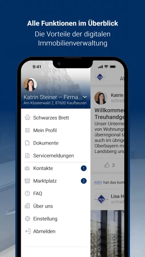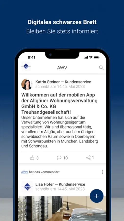 Als Kunde der Allgäuer Wohnungsverwaltung GmbH & Co. KG Treuhandgesellschaft profitieren Sie von einem besonders innovativen Kundenservice, der Ihnen viele Freiheiten bietet. Mit der AWV App können Sie uns rund um die Uhr Anliegen und Schäden inklusive Fotodokumentation per Smartphone melden. Zusätzlich stellen wir Ihnen eine digitale Dokumentenmappe mit wichtigen Dokumenten für Ihre Immobilie(n) zur Verfügung. Über das digitale schwarze Brett informieren wir via Push-Nachricht proaktiv über wichtige Informationen rund um die uns anvertrauten Immobilien.