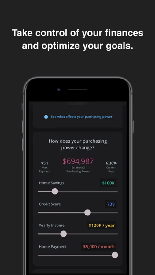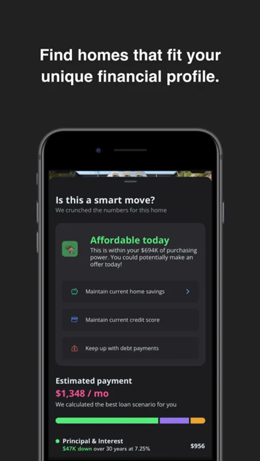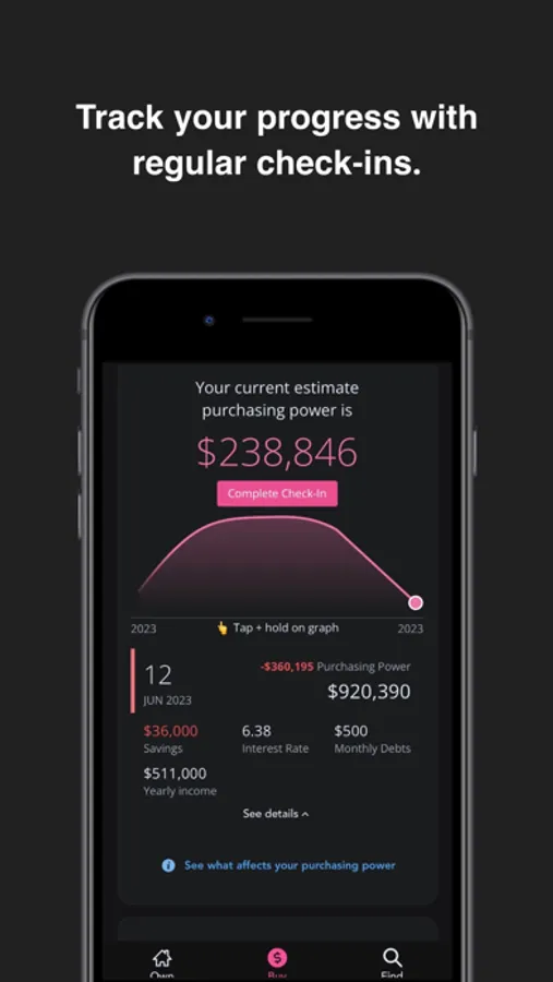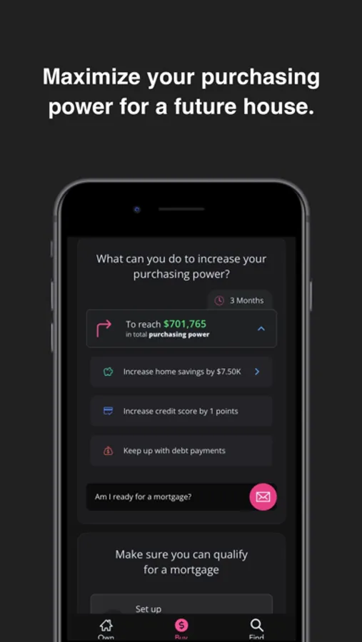 Are you in the market for a new or second home? Homebot calculates your purchasing power, showing you exactly how much you qualify for. Discover the aspects of your finances to improve, such as savings, credit, or debt, and work hand in hand with your home advisor to achieve your home-buying goals. Track your progress over time and witness your purchasing power grow.