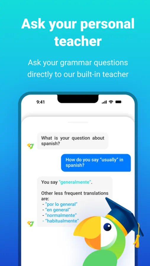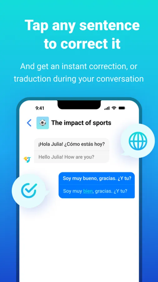 • REAL-TIME CORRECTION: Unsure about a sentence you just used? Simply tap it to get tips on how to improve your phrasing. Have a specific grammar, conjugation, or vocabulary question? Just ask our built-in teacher.