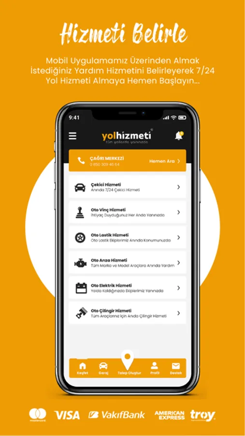 "YOL HİZMETİ" mobil uygulamasını telefonunuza indirin ve uygulamaya kayıt olun. Ardından ihtiyaç duyduğunuz her an Türkiye'nin dilediğiniz yerinde uygulama üzerinde almak istediğiniz yol yardım hizmetini seçin, konumunuzu belirleyin ve en yakın yol yardım ekibimiz en kısa sürede size ulaşsın.