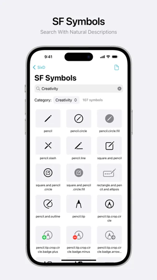 • Browse all SF Symbols and search them with natural descriptions ("share" instead of "square.and.arrow.up")