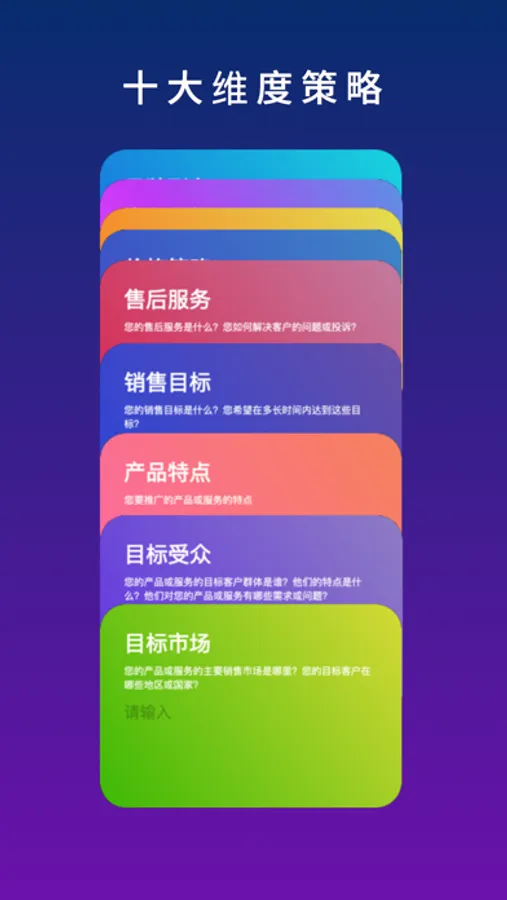 AI工具通过各个维度计算你输入的信息, 给出你精确的文案结果. 九大维度: 目标客户,策略,销售目标,竞争,受众,产品特点,品牌,价格,售后.