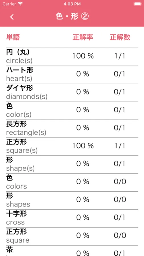 ③苦手な単語がわかる:単語ごとに正解率が表示されるので、苦手な単語を克服
