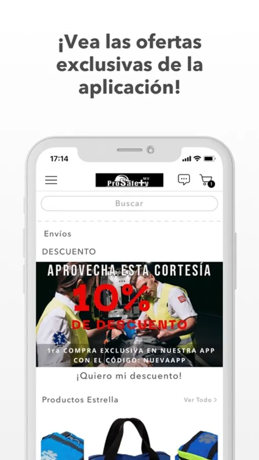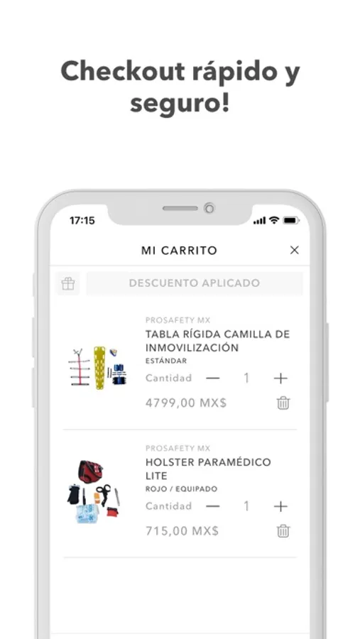 En nuestra app podrás encontrar una forma sencilla, ágil y segura de hacer tus compras de equipo prehospitalario. Pasos simples para agregar tus productos al carrito y poder completar tu compra con nuestras distintas alternativas de pago, ya sea por transferencia, efectivo o tarjetas bancarias.