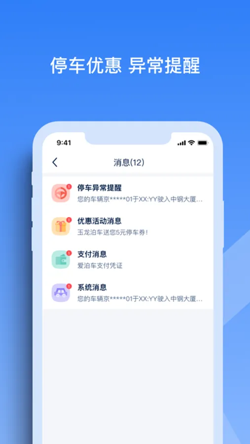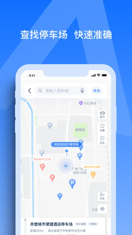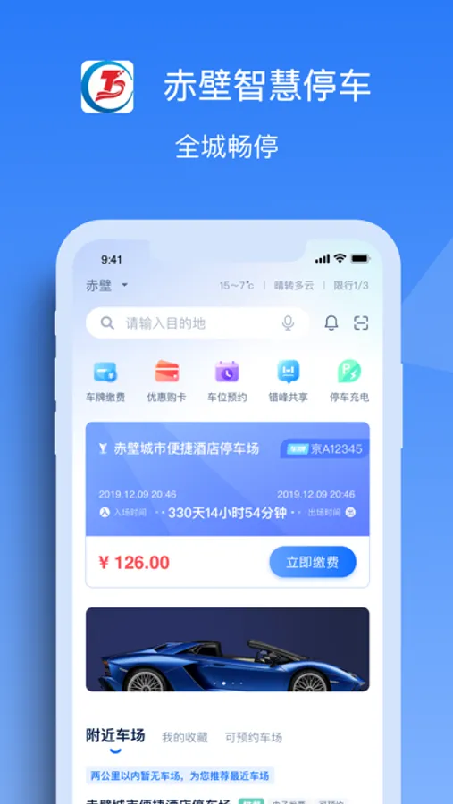 赤壁智慧泊车主要为基于手机的应用APP,为C端用户提供查找车位、导航、缴费支付、消息通知、查看停车记录、参与优惠活动、反馈意见等功能,方便市民出行!