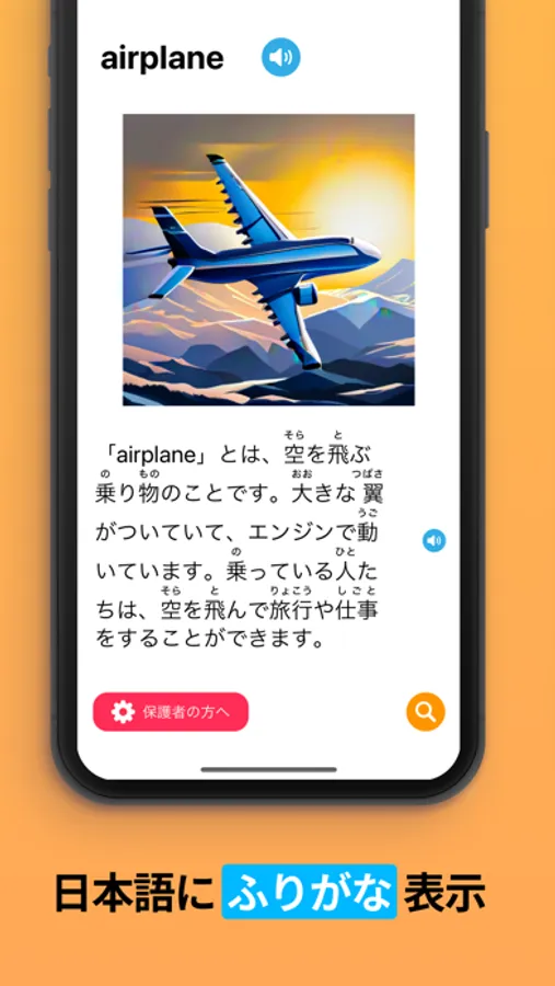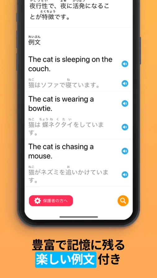 全ての単語に記憶に残りやすい豊富で楽しい例文付き。全ての文章に音声とイラストがついていますので、まだ文章が読めないお子様でも楽しくご利用いただけます。