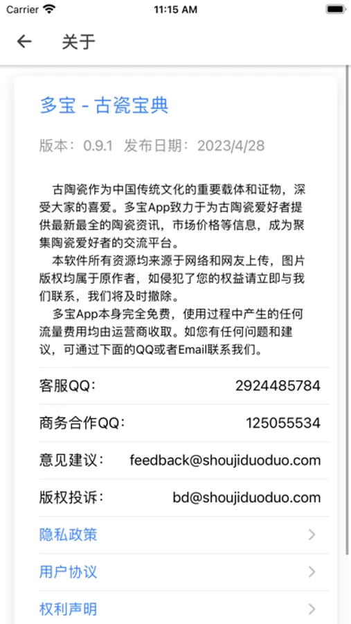 古陶瓷作为中国传统文化的重要载体和证物,深受大家的喜爱。多宝App致力于为古陶瓷爱好者提供最新最全的陶瓷资讯,市场价格等信息,成为聚集陶瓷爱好者的交流平台。本软件所有资源均来源于网络和网友上传,图片版权均属于原作者,如侵犯了您的权益请立即与我们联系,我们将及时撤除。多宝App本身完全免费,使用过程中产生的任何流量费用均由运营商收取。