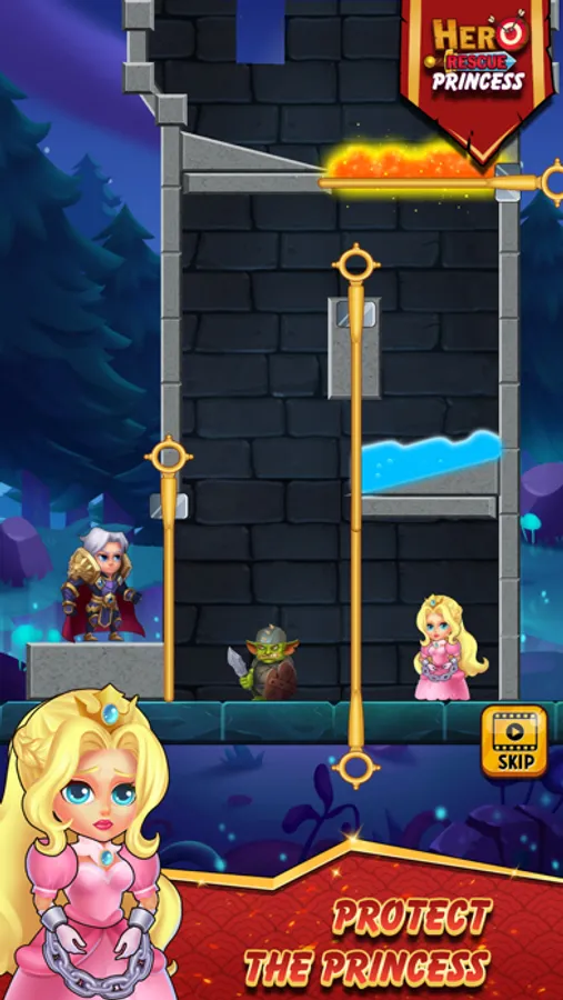 "Hero Rescue - Pull The Pin you will help the hero to rescue the princess from danger. Pull the pins and complete the task.