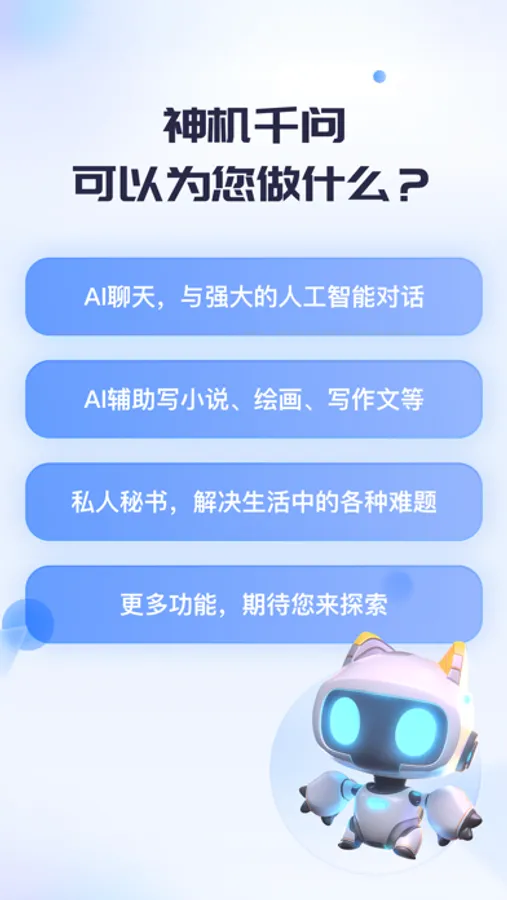 神机千问是由最新人工智能模型产出的机器人,这是一个革命性的AI,拥有世界最先进的语言模型,可以无障碍沟通任何领域问题,它可以解决您工作、生活、学习中的所有问题,带你开启人工智能时代。