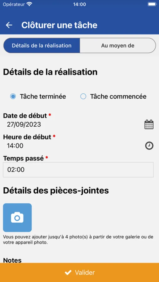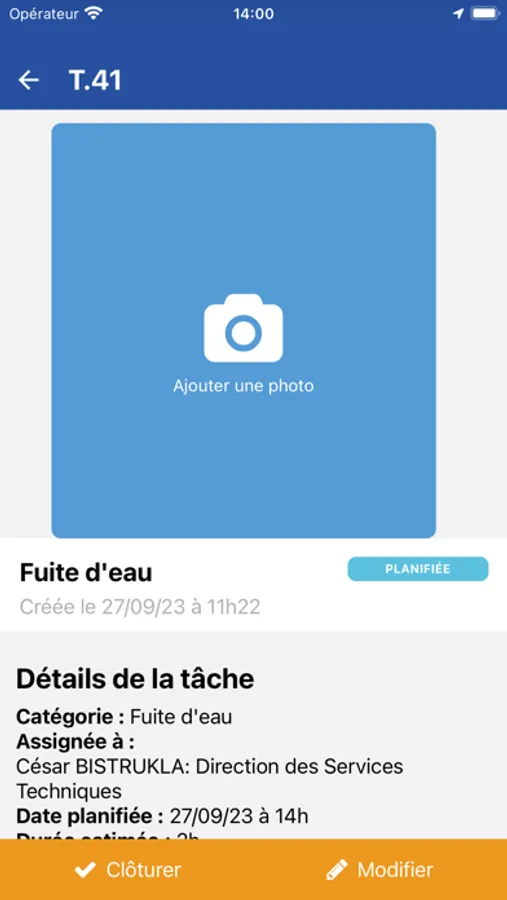 • Une tâche est terminée ? Il suffit de la clôturer en quelques secondes avec la date, l’heure et la durée de réalisation. L’agent peut également valoriser son travail en ajoutant des photos du résultat et un commentaire.