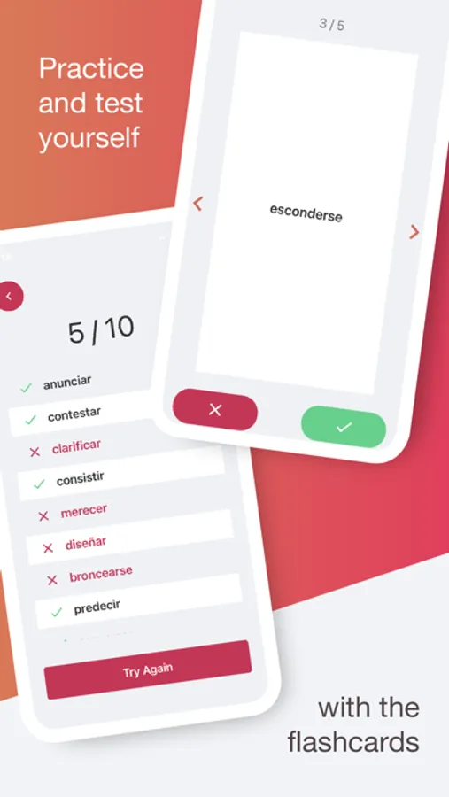 Here's your new app to learn, translate, and search for hundreds of Spanish Verbs and their conjugations. All verb moods and tenses are easy to find and learn. Practice and test your knowledge with the flashcards / memory cards