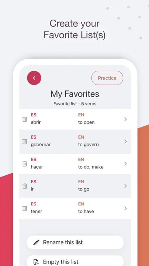 - Create favorite lists to save your favorite verbs, you can then use the flashcard to learn and review these favorite verbs