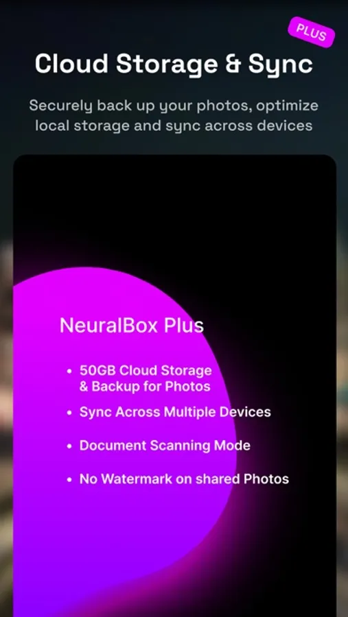 With NeuralBox Plus, your photos are secure and accessible across any device. Benefit from virtually unlimited cloud storage while keeping your device memory optimized.