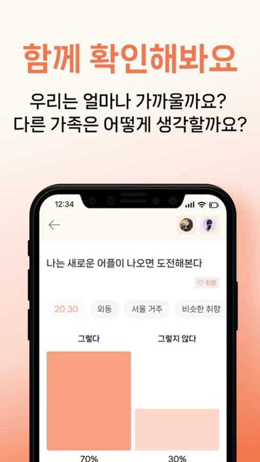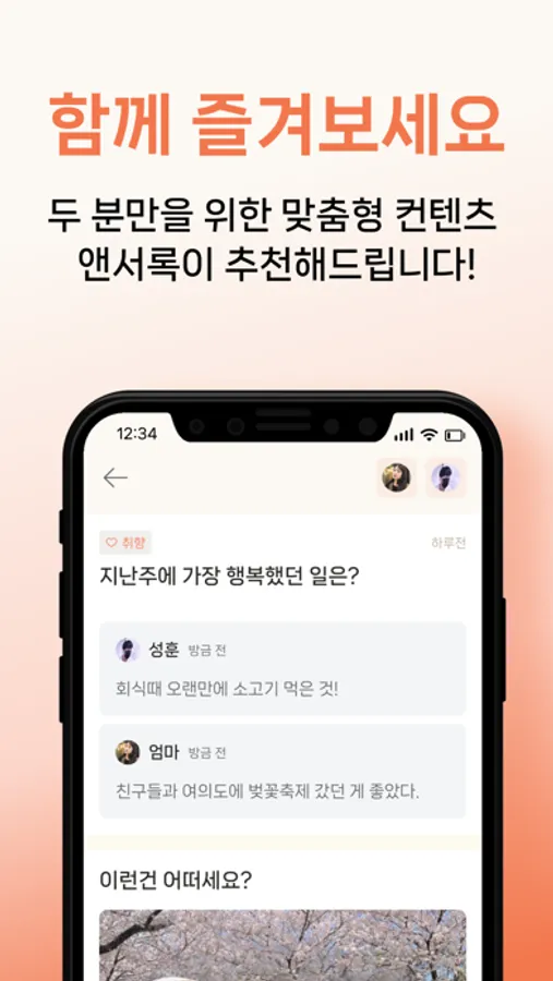 문답에 답변을 하시면, 두 분의 답변 키워드를 기반으로 부모님과 자녀 유저를 위한 공통의 컨텐츠가 추천됩니다. 두 유저의 취향을 아우르는 컨텐츠를 즐기시고 함께 이야기해보세요!