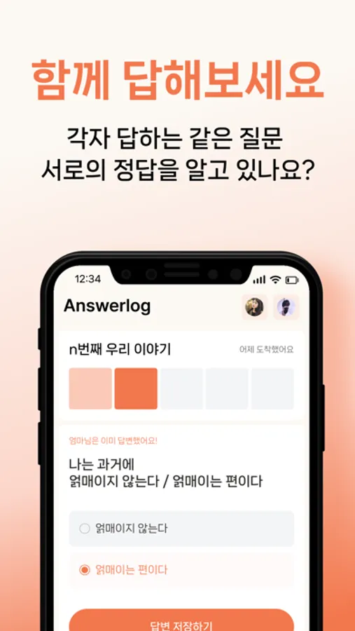 앤서록은 성인자녀와 부모님 사이에 재미있고 친근한 관계를 쉽게 유지할 수 있게 도와드립니다. 부모님과 자녀는 1대1로 연결되어 2~3일 마다 제공되는 캐주얼하고 재미있는 문답 질문에 답변하고, 이 답변은 연결된 상대방에게만 공유됩니다. 이를 통해 서로에 대해 더 많이 알아가고, 가족 구성원 간의 유대감을 강화할 수 있습니다.