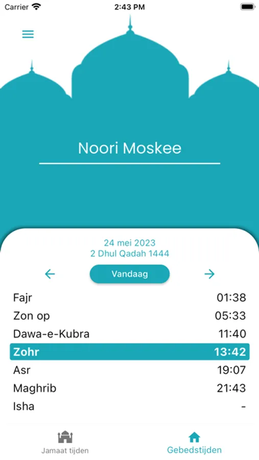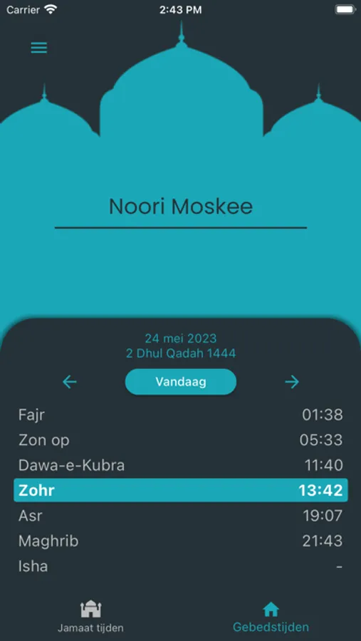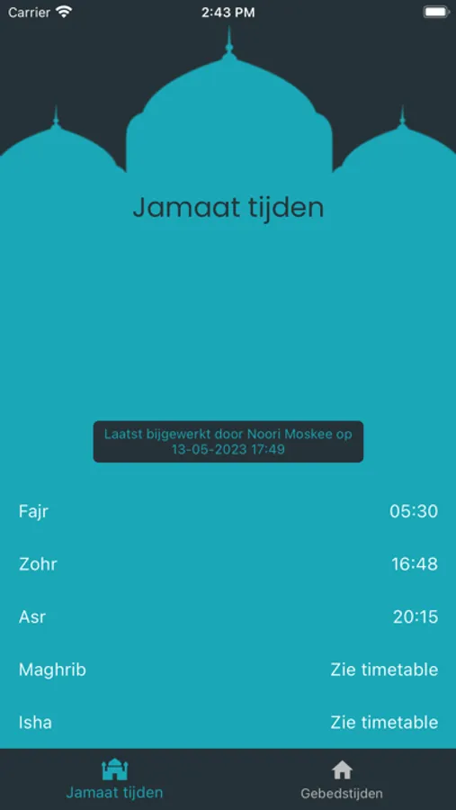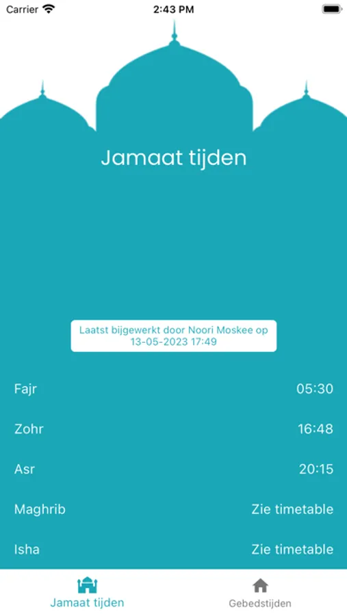 Zie de dagelijkse gebedstijden zoals gehanteerd door jouw moskee in deze app. Indien jouw moskee bij ons is aangesloten, kun je ook de meest recente jamaat tijden zien! Wanneer de moskee de jamaat tijden wijzigt, krijg jij een melding opgestuurd dat de jamaat tijden zijn gewijzigd.