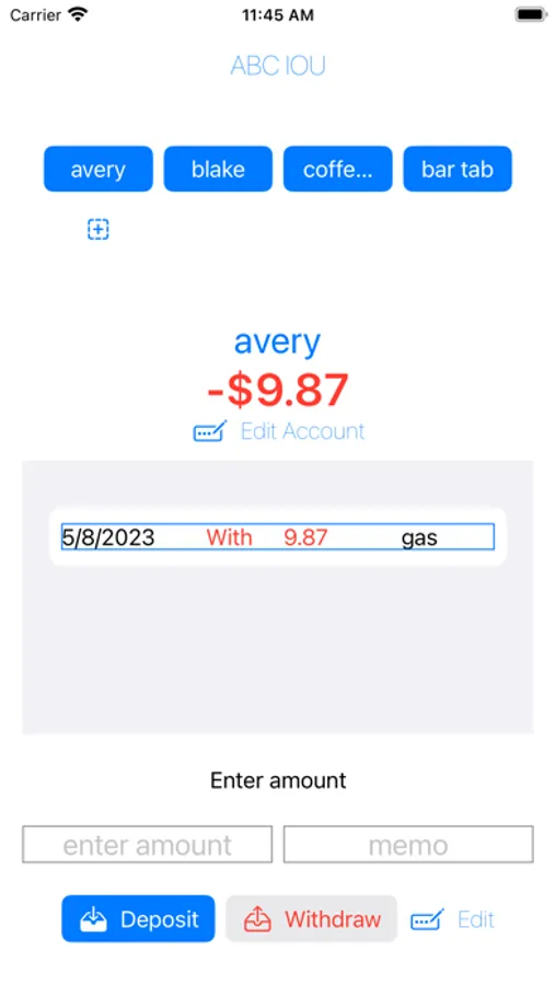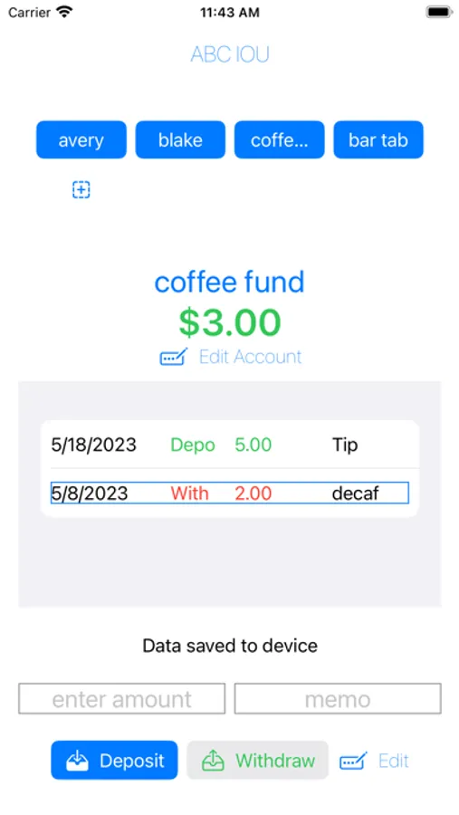 A quick and easy IOU app for everyday use. Instantly view your balance. Tap 1 button to add an account. Tap 1 button to switch between accounts. Tap 1 button to record an IOU. Swipe to delete an IOU. Scroll to view your recent IOUs. Manage up to 12 accounts. Quickly edit account names or delete accounts. Quickly edit IOUs.