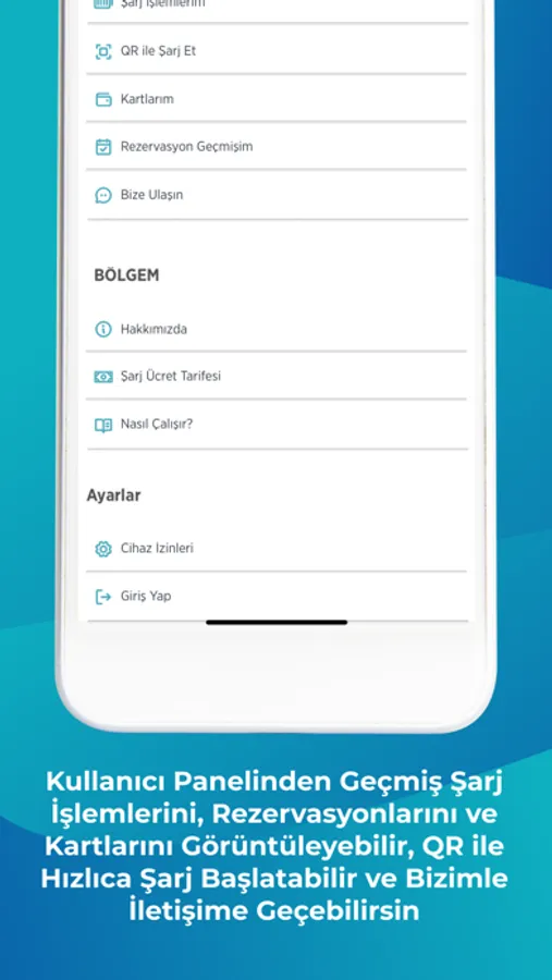 BÖLGEM mobil uygulaması ile BÖLGEM Şarj İstasyonlarının konumunu kolayca görüntüleyebilir, rezervasyon yapabilir ve favori istasyonlar listenizi oluşturabilirsiniz. QR kodu okutarak hızlıca şarj işlemi başlatabilir, şarj durumunu görüntüleyerek işlemi kolayca sonlandırabilir ve geçmiş kullanımlarınızı kullanıcı panelinizden inceleyebilirsiniz.