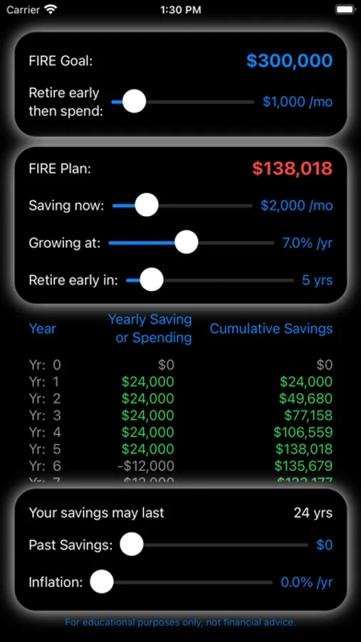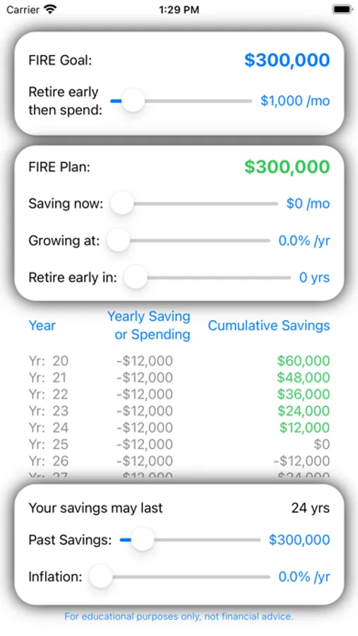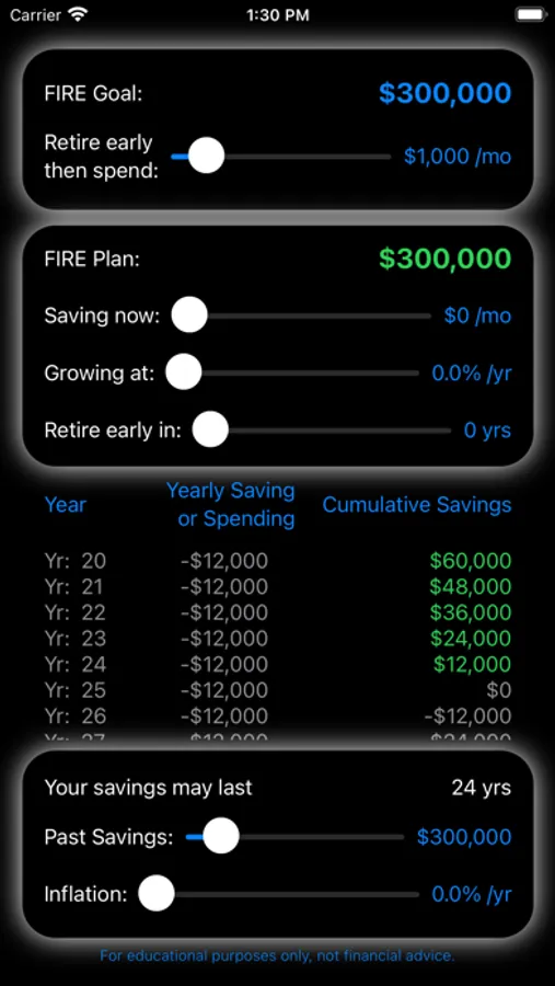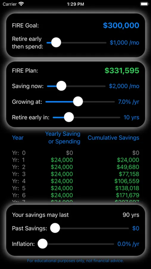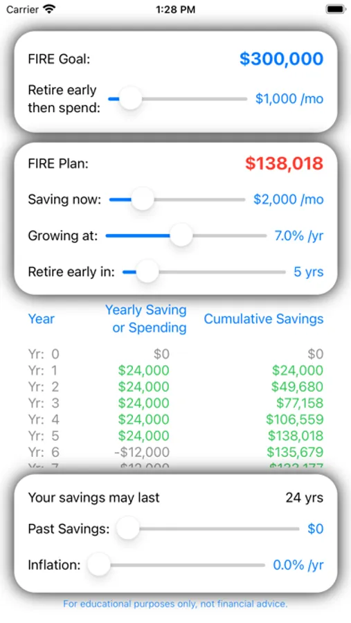 Do you daydream about retiring early? Do you want to retire now? Use this easy calculator to see if you are ready. Plan your early retirement. See the power of compound interest. Adjust any slider to see if your numbers match your goal. Quickly see if your plan will work by watching for the green color. If you can reach your goal, the panel turns green. Add in your current savings. Move all the sliders to zero to see if your current savings can help you retire today. See how inflation affects your can savings and spending. This app is fun and friendly for everyday use.