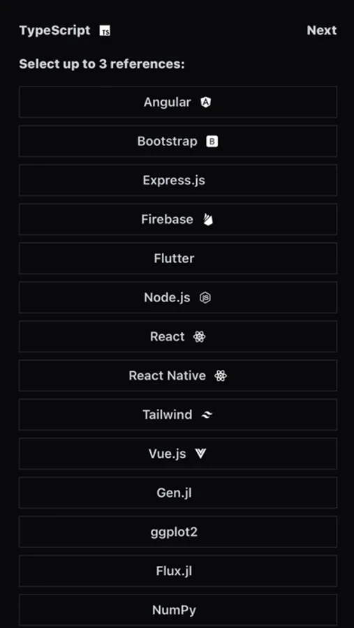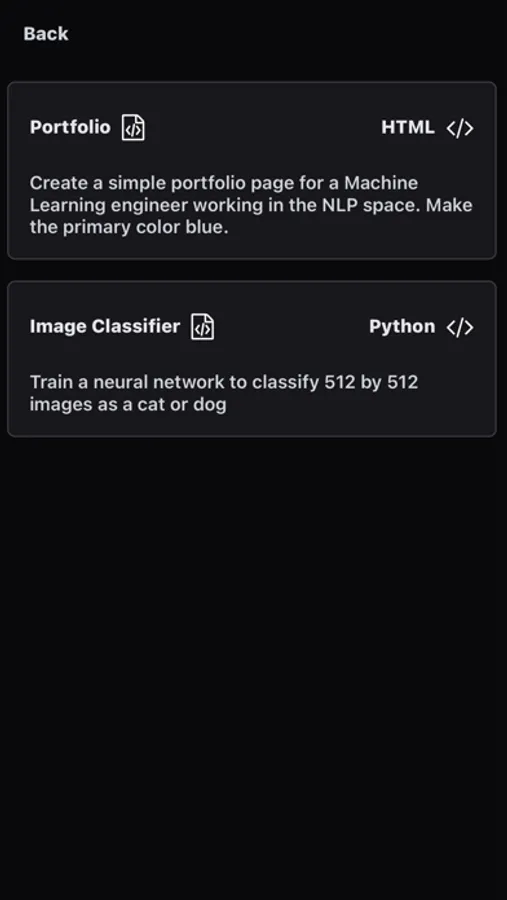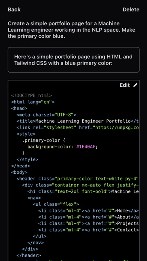 Example workflow: You are at dinner and you want to start building a new resume. You select HTML as your primary language and decide to style your page with Tailwind CSS. You describe your work history and you page is built for you in less than a minute!