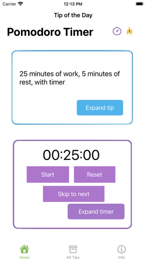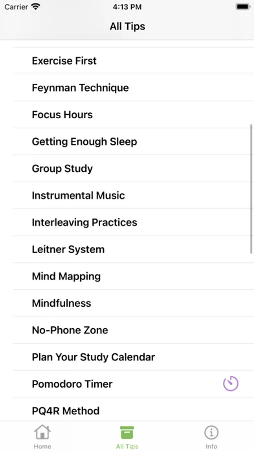 Many of the tips lead you through a series of alternating work and break times. They include a built-in timer that alternates between intervals of different lengths. You can use the “Expand Timer” button to enlarge the timer and focus solely on the countdown time remaining to stay focused. The timer will pause when you leave the app, helping you to avoid distractions on your phone Happy studying!