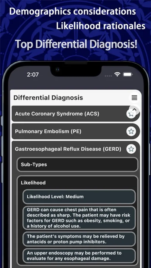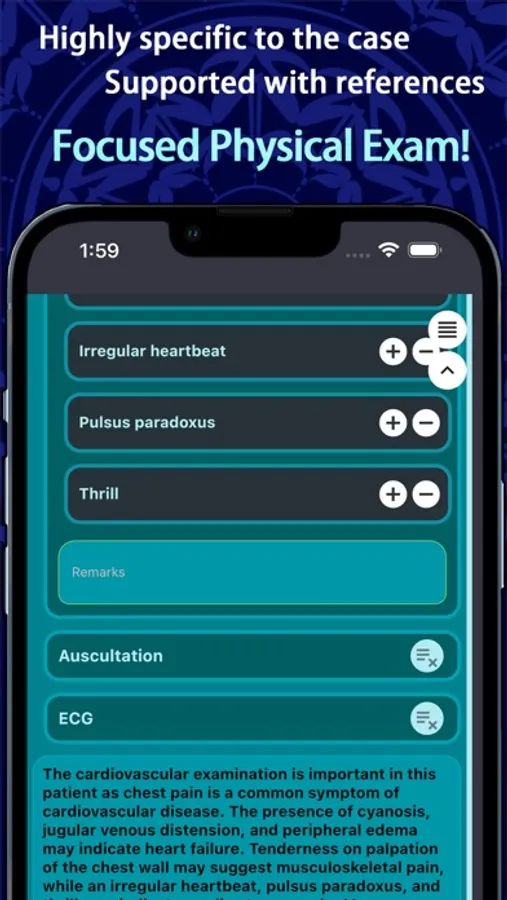 Focused physical examination: Our app saves time and effort by prioritizing important signs to look for during a physical exam, and even includes tools like bedside ultrasound, ECG, dipstick, and peak flow meter to aid in the process.