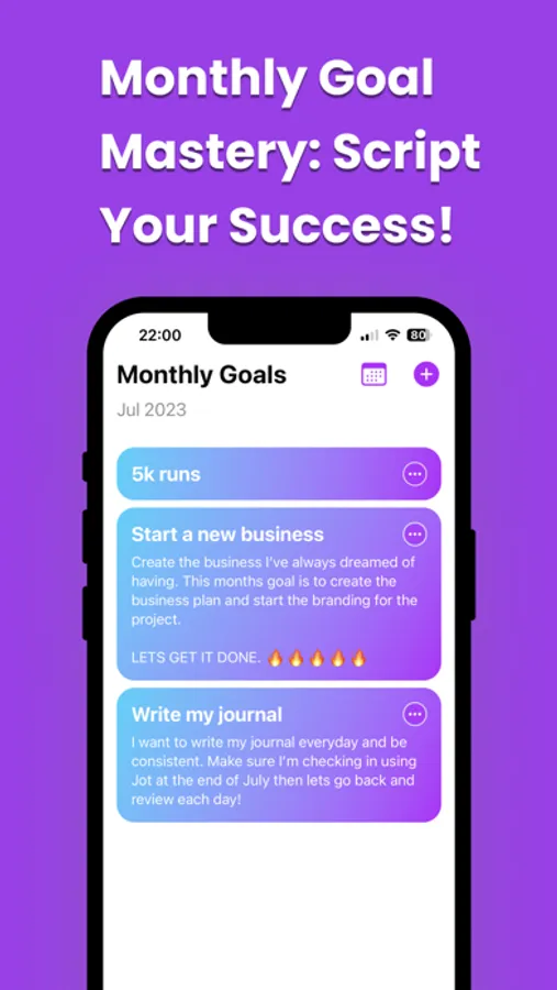 Monthly Goals: Set ambitious targets and track your progress. MindJot empowers you to define monthly goals, break them into actionable steps, and monitor your achievements along the way.