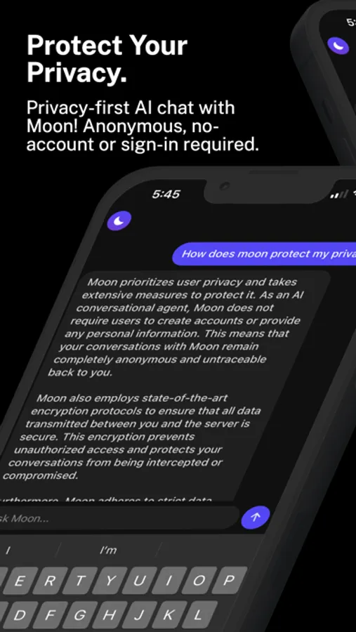 Introducing Moon: Your go-to for Anonymous AI Chat and Private Conversations. No account required! Experience meaningful, human-like interactions with our AI-powered assistant, offering the most affordable subscription plans for top-quality, intelligent chat. An active subscription is required to use all of the app features.