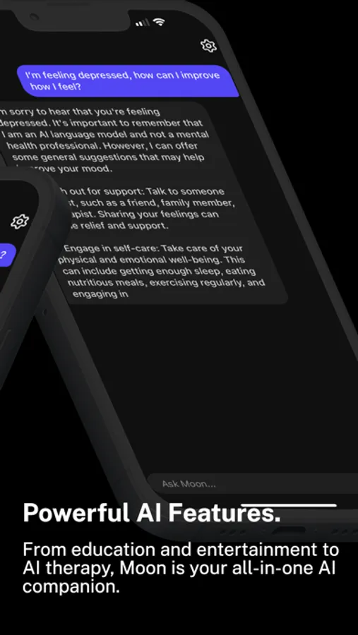 Versatility with AI: From casual conversations to AI educational experiences and AI therapy, Moon leverages AI's powerful capabilities to meet your needs.