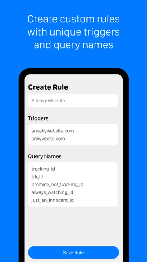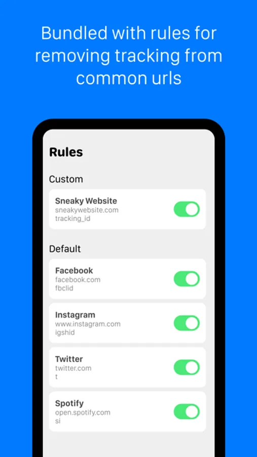 PRELOADED RULES: Clean Share comes bundled with a comprehensive set of rules designed to remove tracking elements from popular URLs, making it easier than ever to share without compromising your privacy.