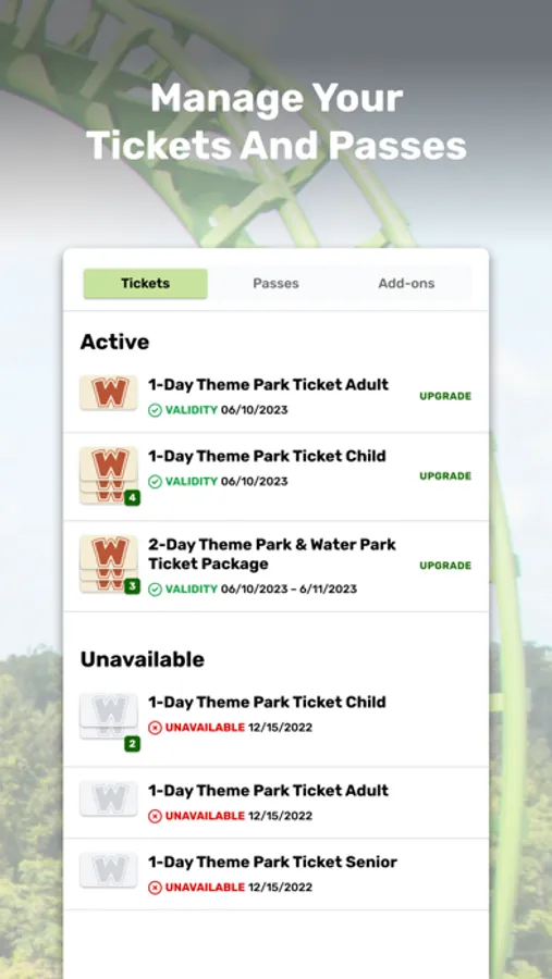 Account Integration - Link your admission tickets, Season Passes, Bring-A-Friend tickets, add-ons, and more for quick access. Utilize the app itself or add your tickets and passes to your phone’s digital wallet for easy entry and use at the parks.