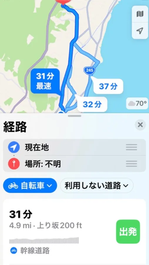 画面中央のナビをタップするとマップが開き、ナビゲーション機能を使うことができます。目的地は最初は諏訪梅林に設定してありますが、利用者がご自由に設定することもできます。
