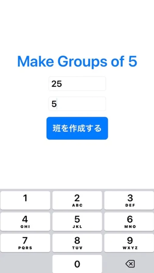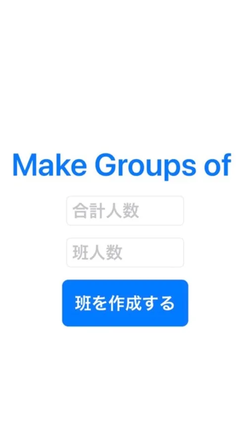 グループ分けアプリです。Number Padで「合計人数」と「班人数」に入力して「班を作成する」をタップすると自動でグループ分けを行います。結果が表示された後で、結果表示を上にスワイプするとNumber Padが隠れます。