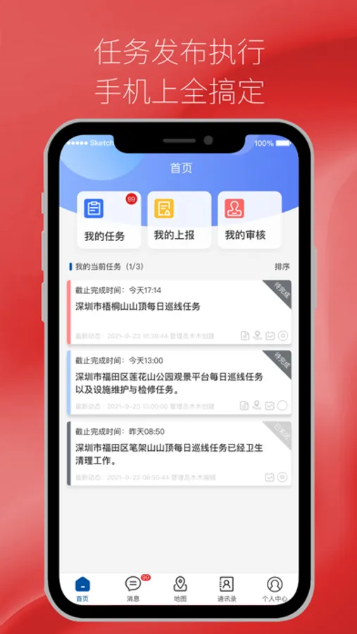 本APP完整保留了“两步路户外助手”的工具性,额外添加了包括任务完成、任务审核、公司组织框架、紧急上报等功能。