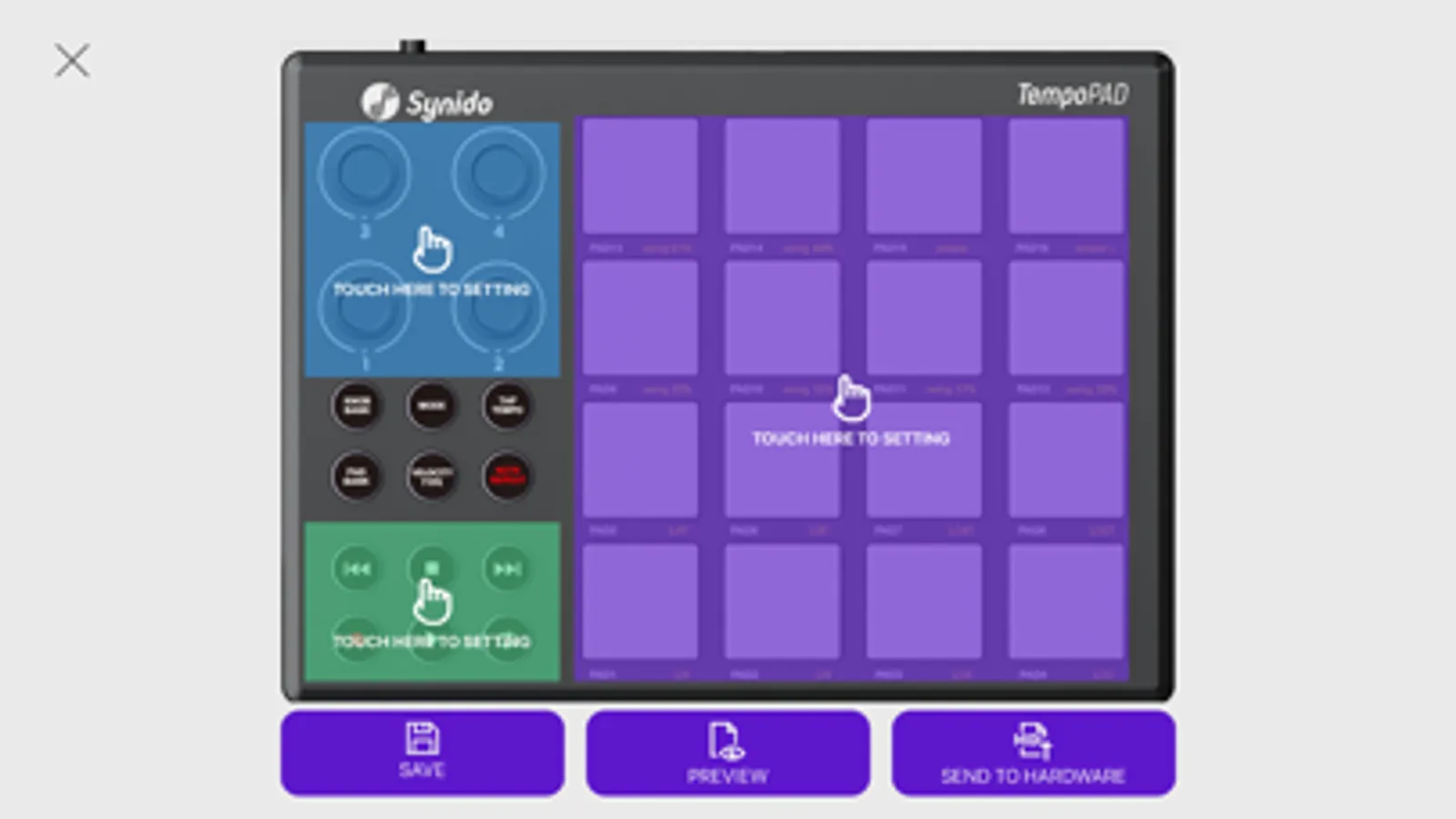The Synido TempoPAD editor software gives you a visual and intuitive way to edit the various MIDI messages that Synido TempoPAD's controls send to your computer, which enhances your workflow to make great-sounding beats.