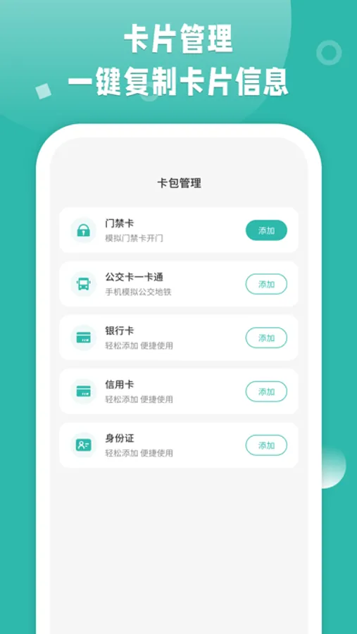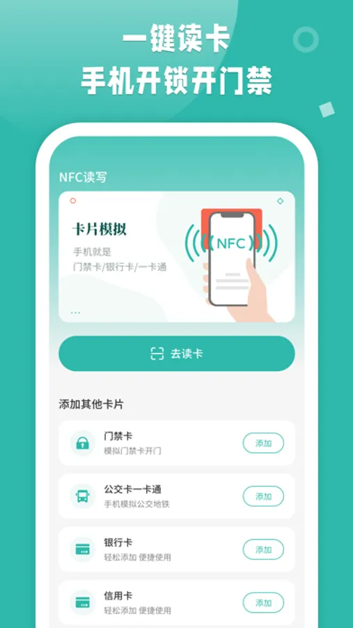 这款NFC门禁卡公交卡小工具界面简洁大方,操作简单易懂,卡包功能全面,一部手机就能放心出门游玩!NFC门禁卡公交卡这个工具助你更好的玩转NFC!