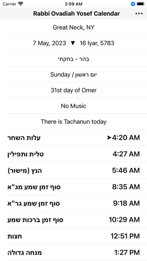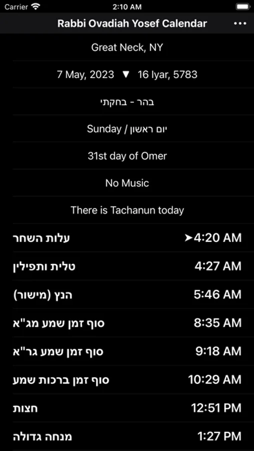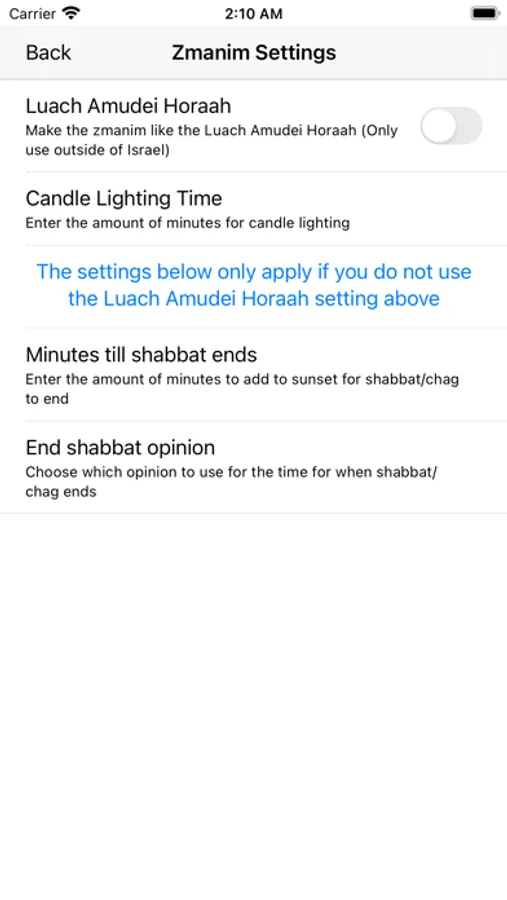 There is also an additional option in the settings to display the zmanim of the Luach Amudei Horaah created by Rabbi Leeor Dahan Shlita. The Amudei Horaah calendar created by Rabbi Dahan is adjusted according to the Halacha Berurah based on your location, and it should only be used outside of Israel in more northern/southern areas.