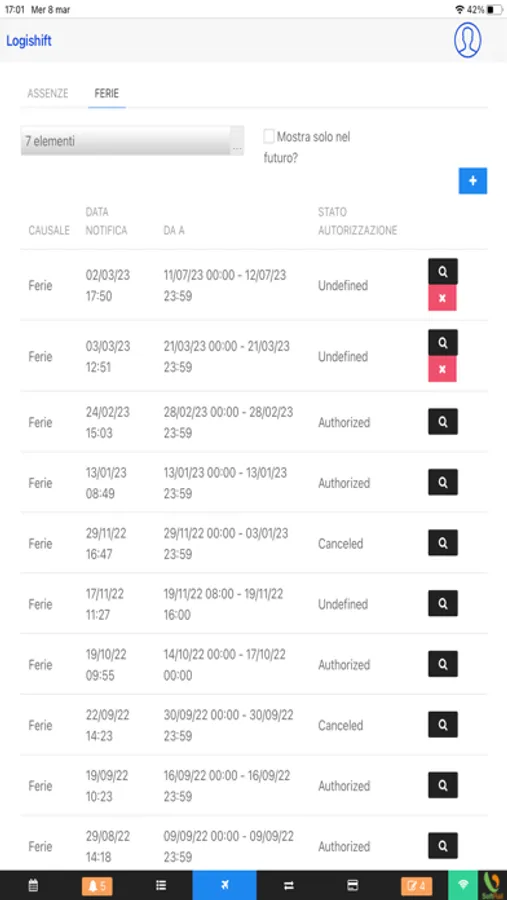 Through the application it is also possible to request holidays and / or absences depending on the activated setups. The application also provides the user with an overview of all requested or assigned absences / holidays. Furthermore, with regard to holidays only, the system also returns data of residual and accrued holidays.