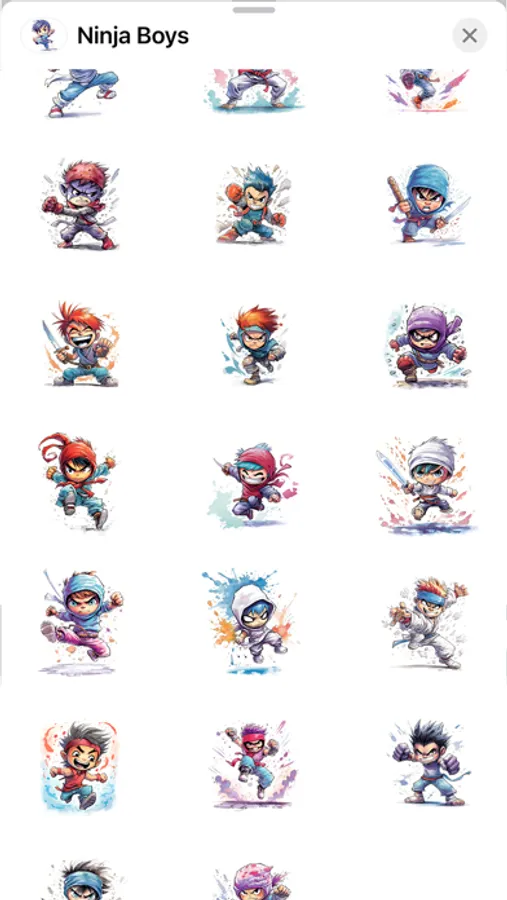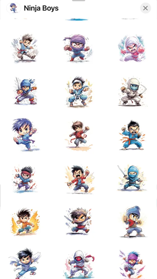 Introducing our Ninja Boys iMessage emoji stickers pack! These watercolor painted young warriors come with a range of colorful action emojis and fighting moods that are perfect for expressing your emotions. Whether you’re feeling brave, determined, or mischievous, these cute and quirky action heroes are sure to add a touch of adventure to your messages. Get ready to unleash your inner ninja and make your texts stand out!