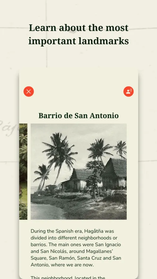 Welcome to Guam. Discover the history and heritage of this pearl of the Pacific. This reconstruction, developed with the most rigorous research and the latest immersive technologies, will transport you to another era. Travel back in time to discover what life was like in 19th-century Guam. Visit cities lost in memory and explore buildings that have already disappeared, thanks to augmented reality.
