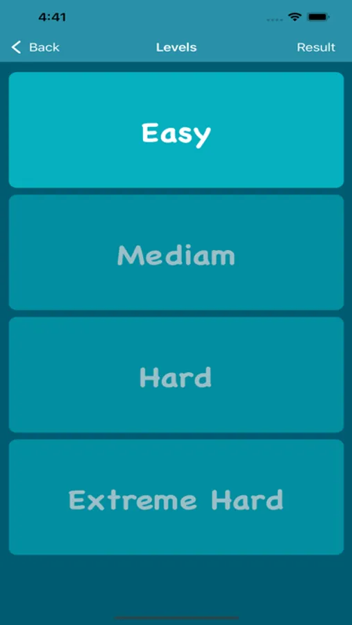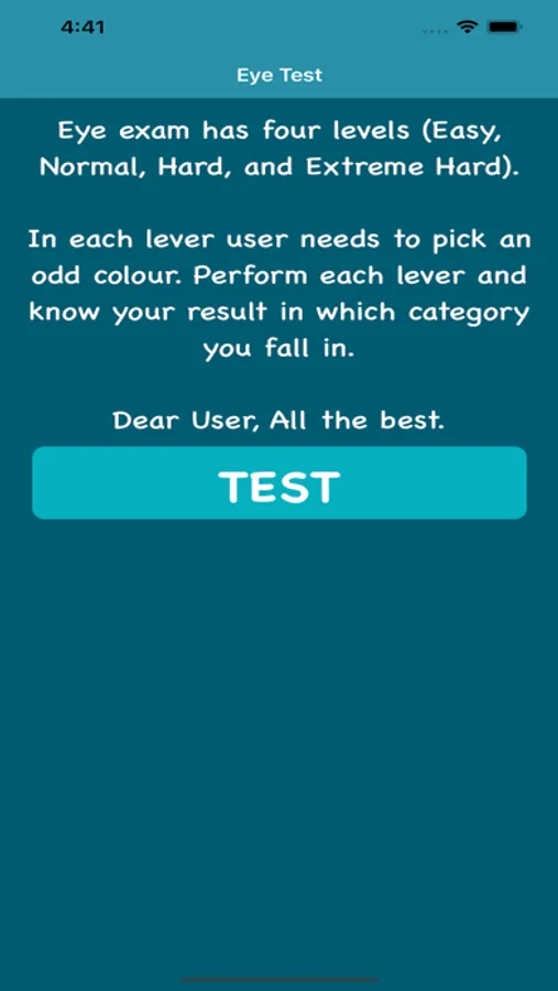Test for eye app has four levels (Easy, Normal, Hard, and Extreme Hard), In each lever user needs to pick an odd colour. Perform each level and know your result in which category you fall in.