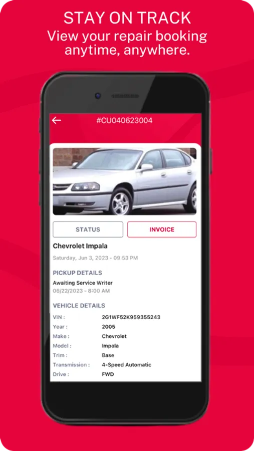 PAYMENT - When the repairs are complete you will be notified in the app. Use the INVOICE page to pay for the services.